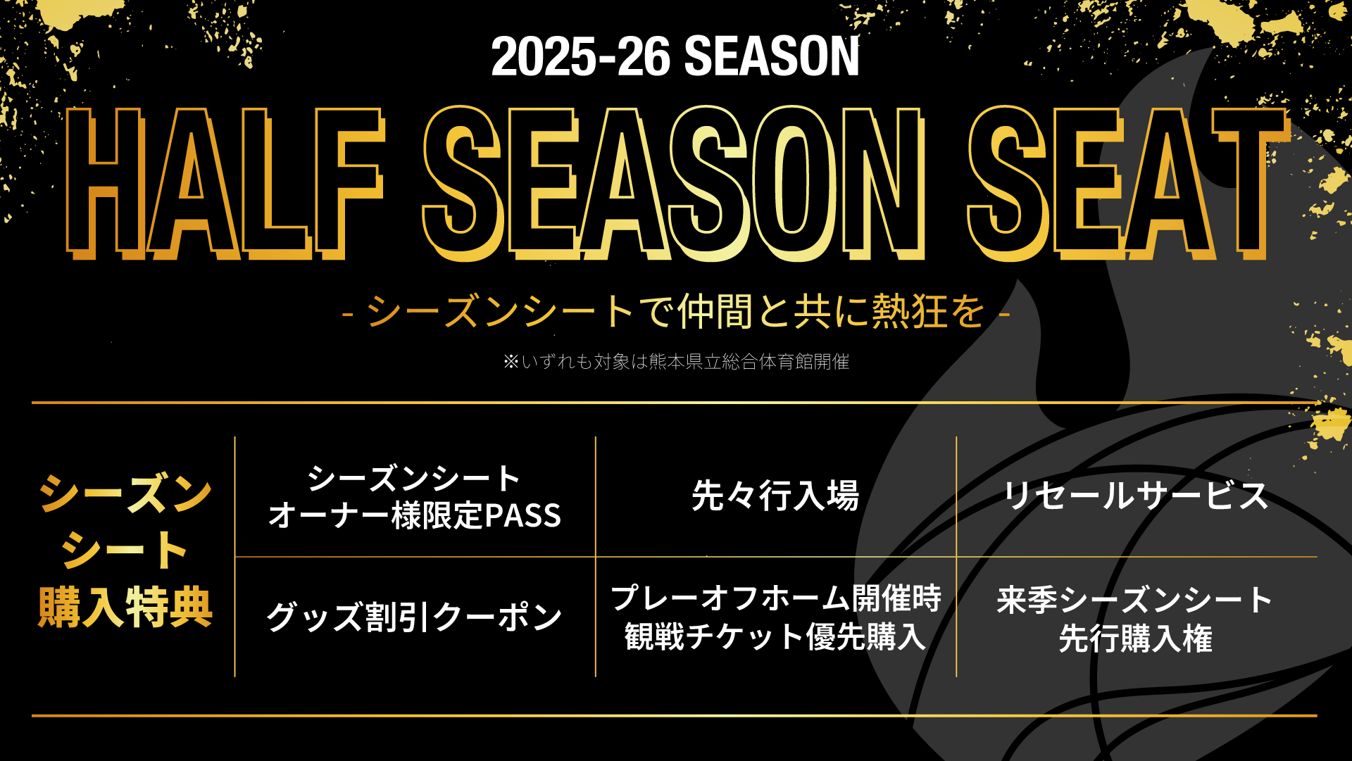 B.LEAGUE2025-26シーズン、熊本県立総合体育館で開催されるホームゲームにおいて1月31日(土)以降の15試合を対象としたハーフシーズンシートを販売いたします。