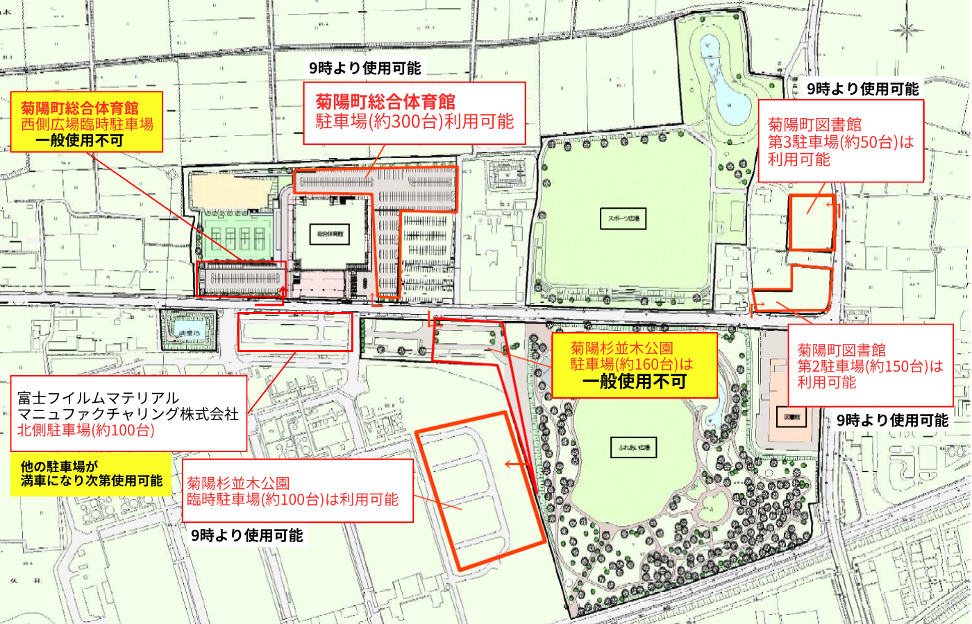 駐車台数には限りがございます。満車となりました場合には駐車できない場合もございますので、出来るだけ公共交通機関をご利用しご来場ください。また、近隣施設への無断駐車・路上駐車等は絶対にお止めください。