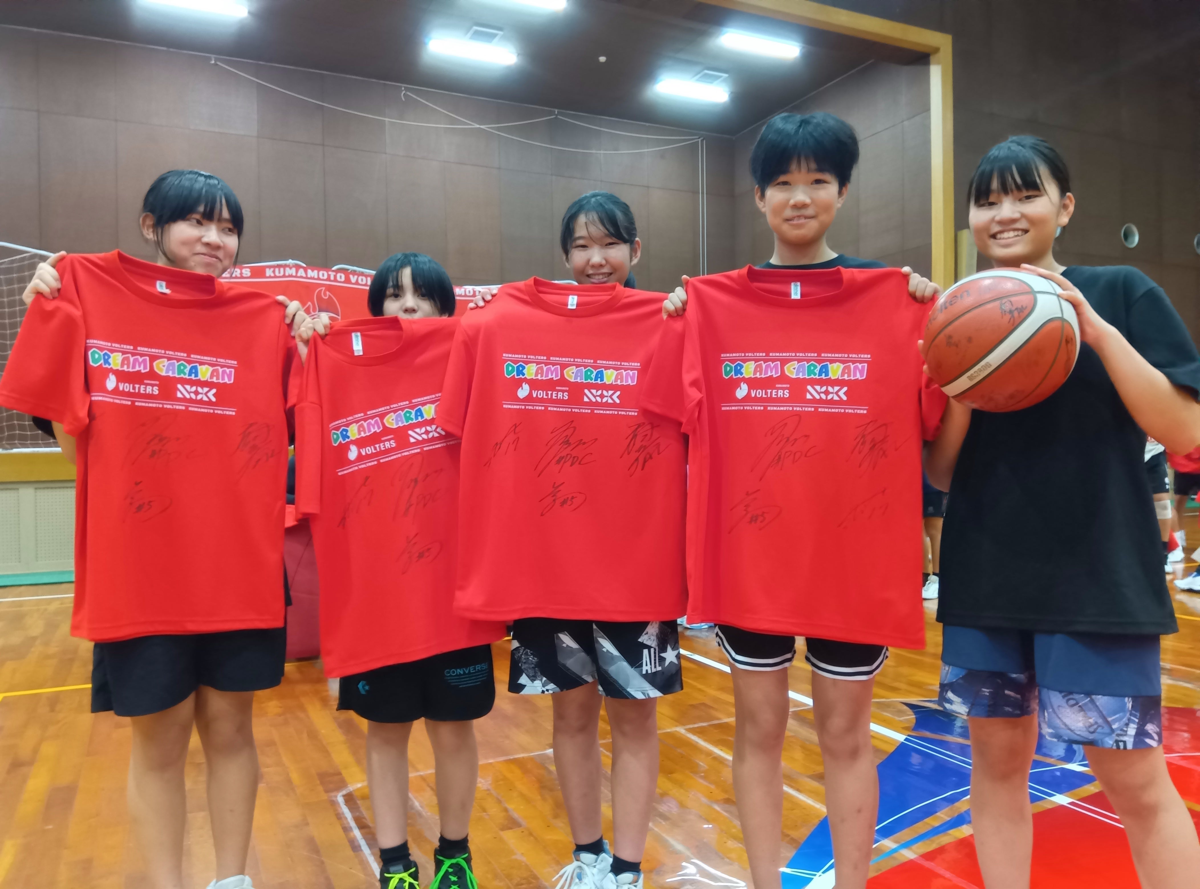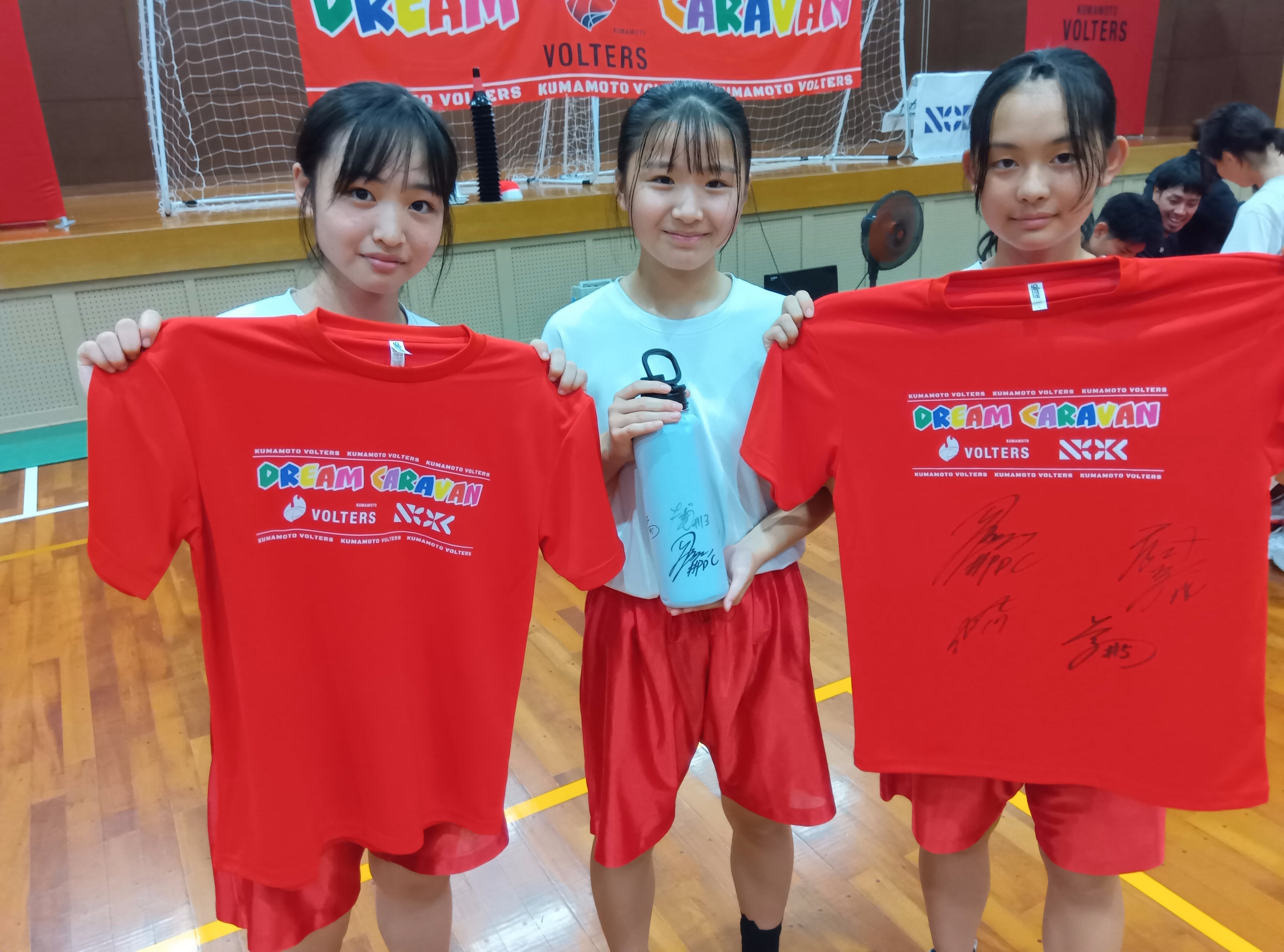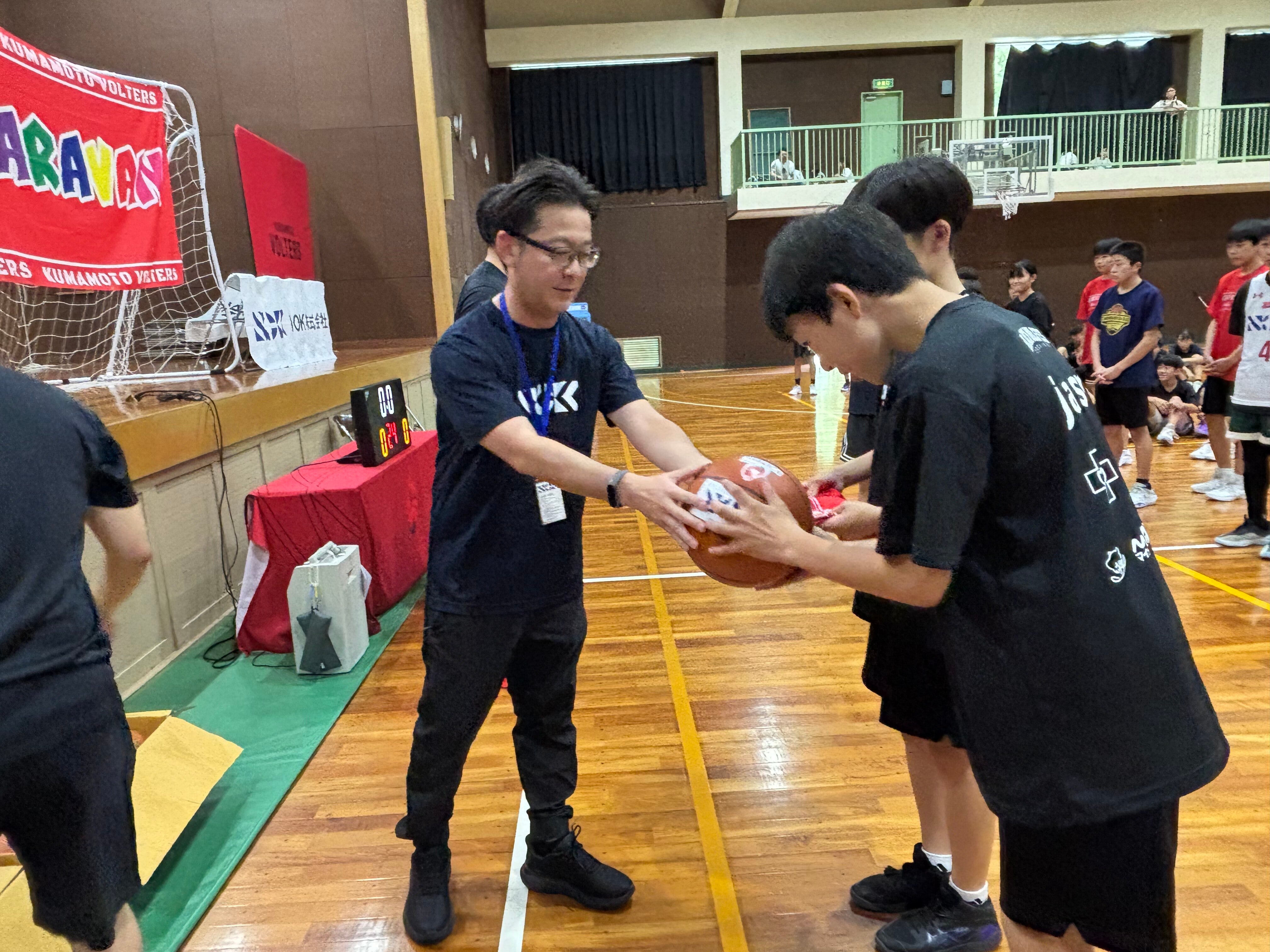 NOK株式会社のご協賛のもと、阿蘇周辺地域の中学生を対象にドリームキャラバンを行いました。まずは、NOK株式会社様よりご挨拶と記念Tシャツ・記念ボールの贈呈式が行われました。