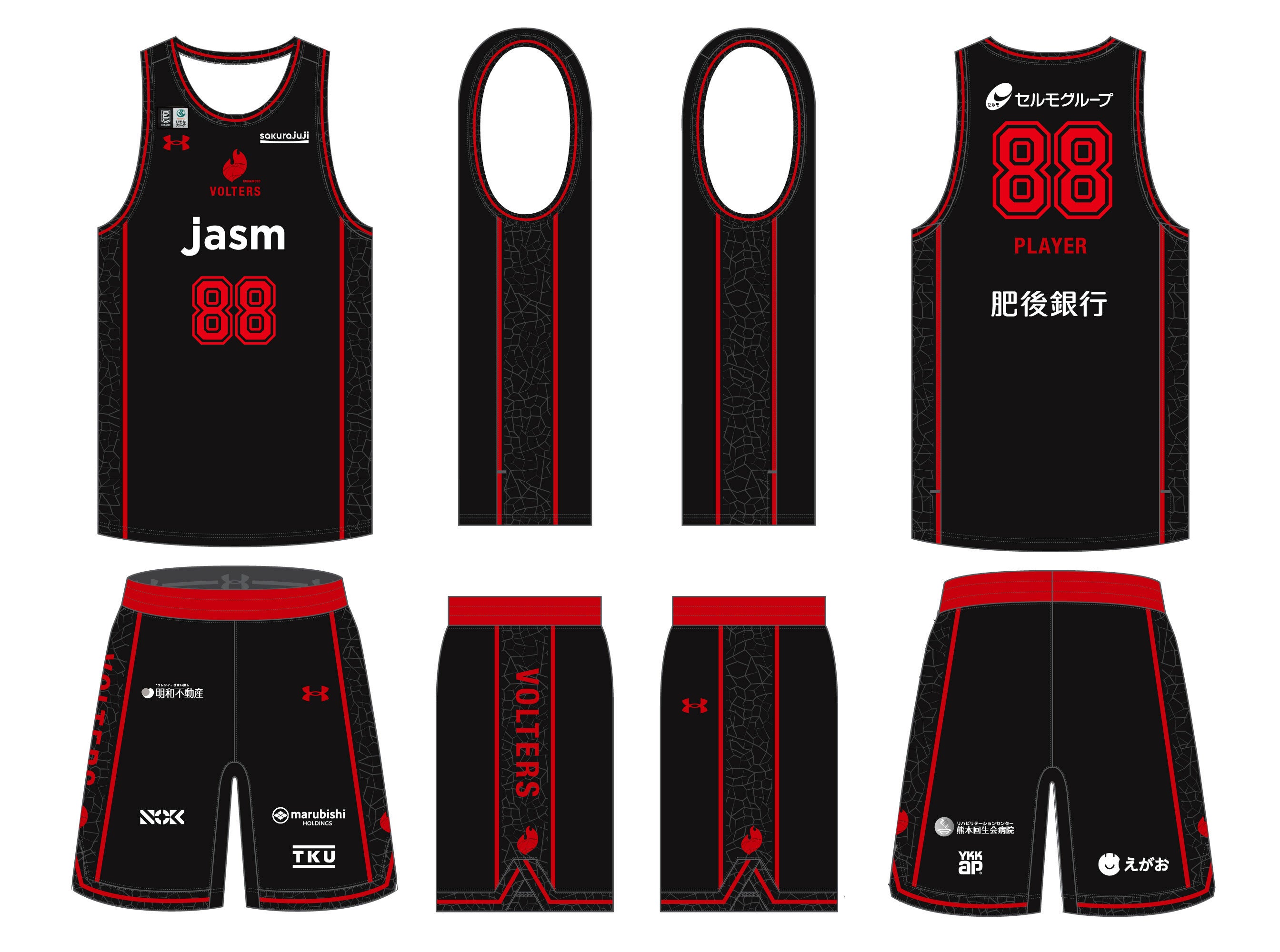 胸には今シーズンもBLACK VOLFES 特別パートナーとして、熊本城の復興に寄与していただく