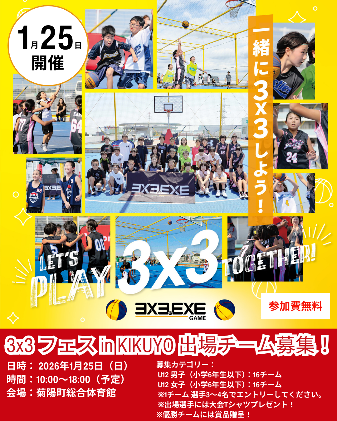 【参加費無料・全員にTシャツ贈呈】U12 3x3バスケの祭典!