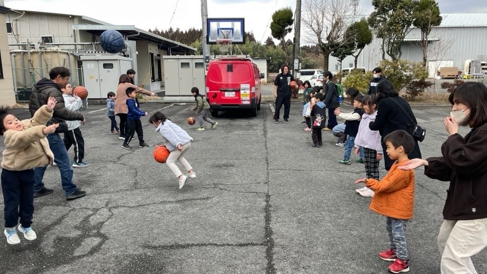 井手スクールコーチによるバスケットボール体験教室では、初めて競技に触れる子どもたちも多く、お友達と楽しくドリブルをしたり、リングに向かってシュートの打ち方を習ったりしました。