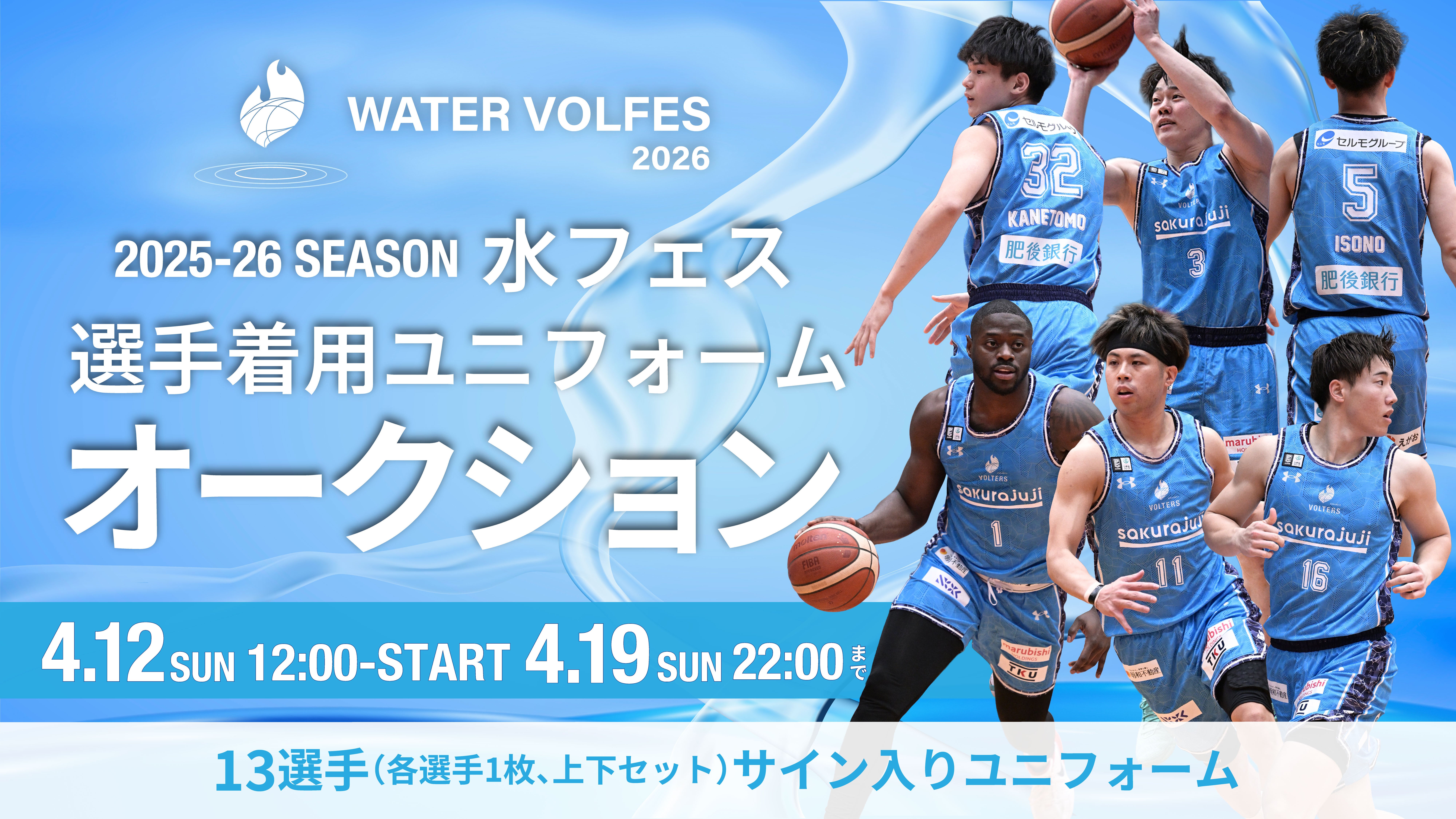 このたび、熊本ヴォルターズでは、2026年3月14日、3月15日の2日間で開催しました「WATER VOLFES 2026」で熊本ヴォルターズの選手が着用した水色の4thユニフォームをネットオークション(ヤフオク!)に出品いたします。