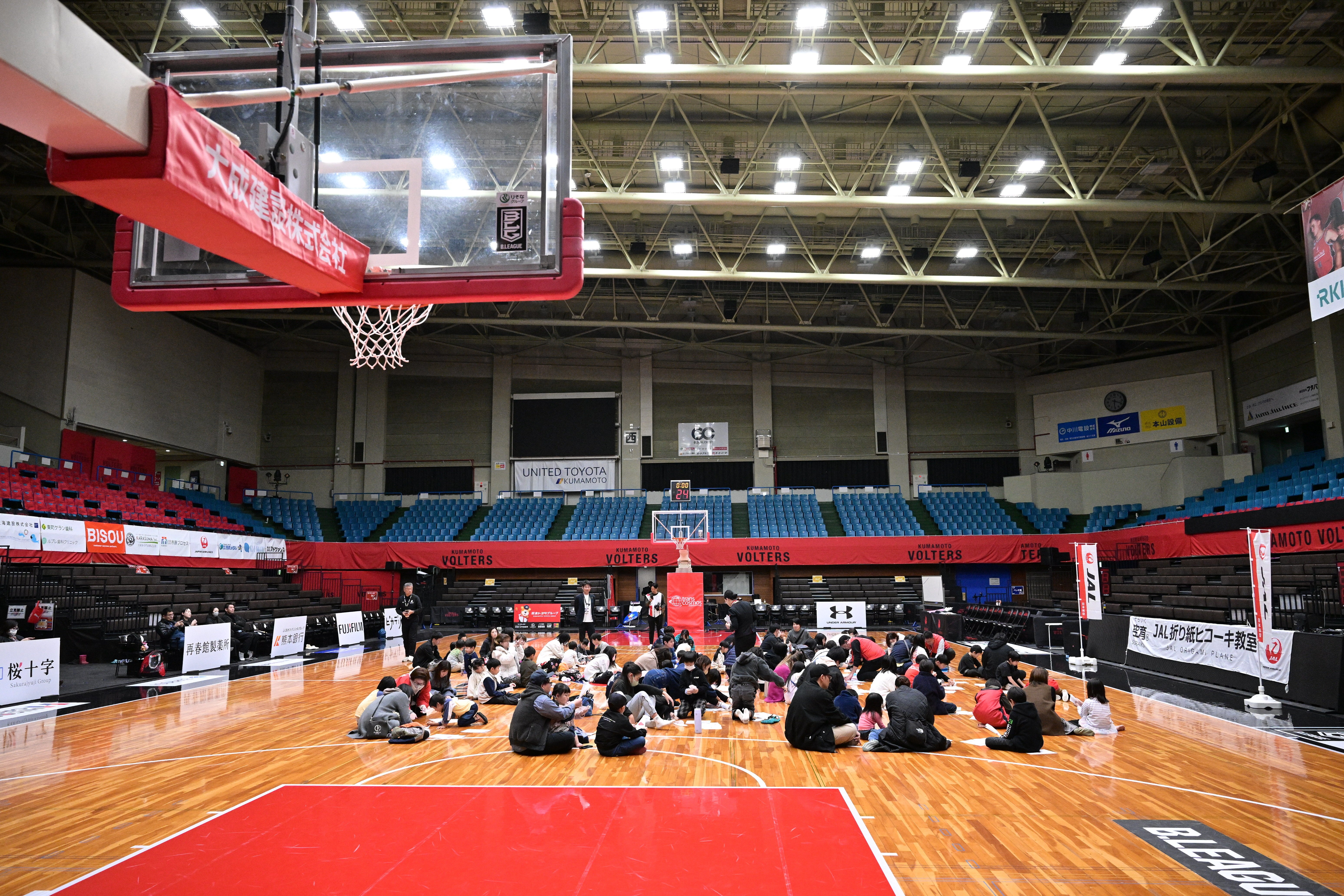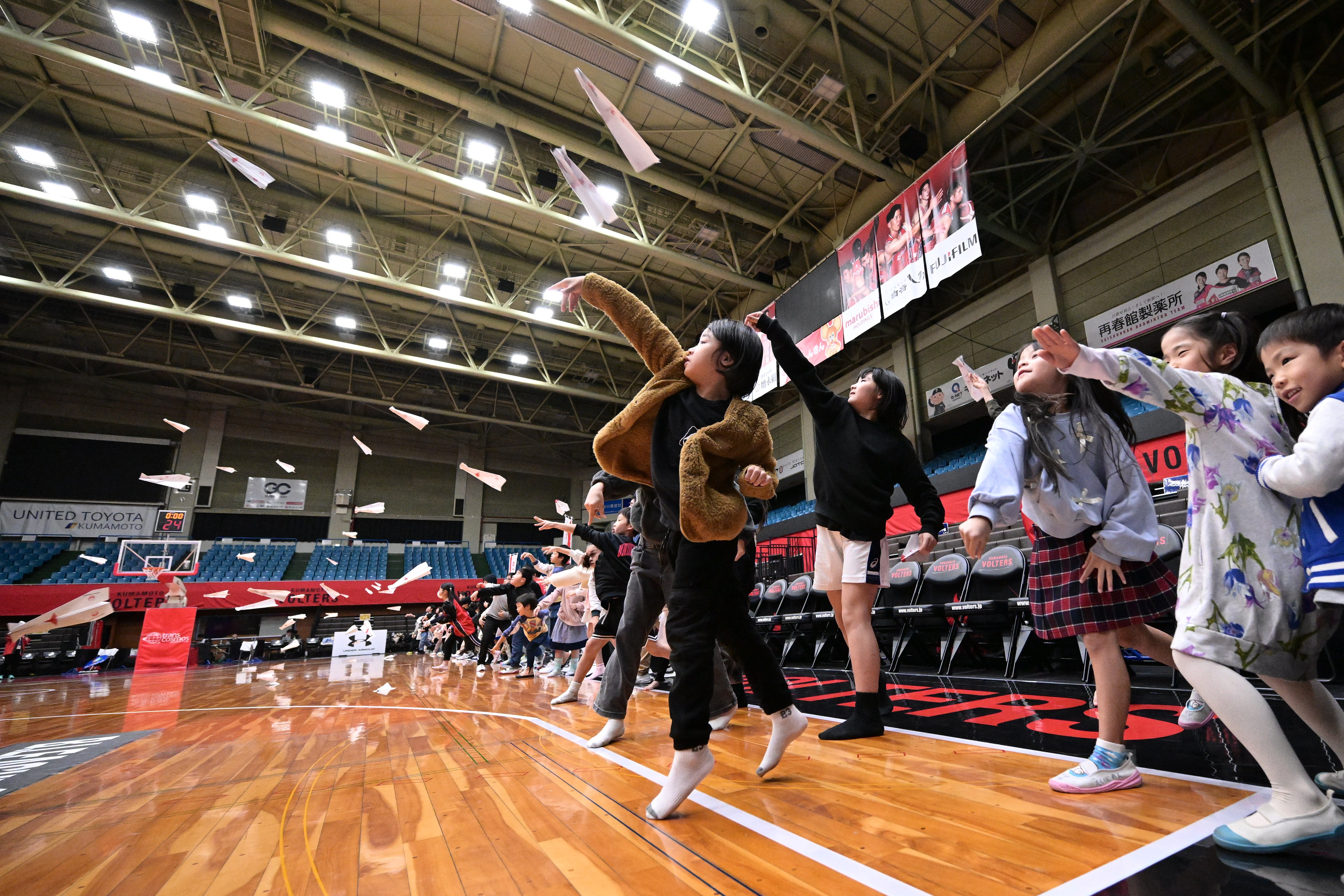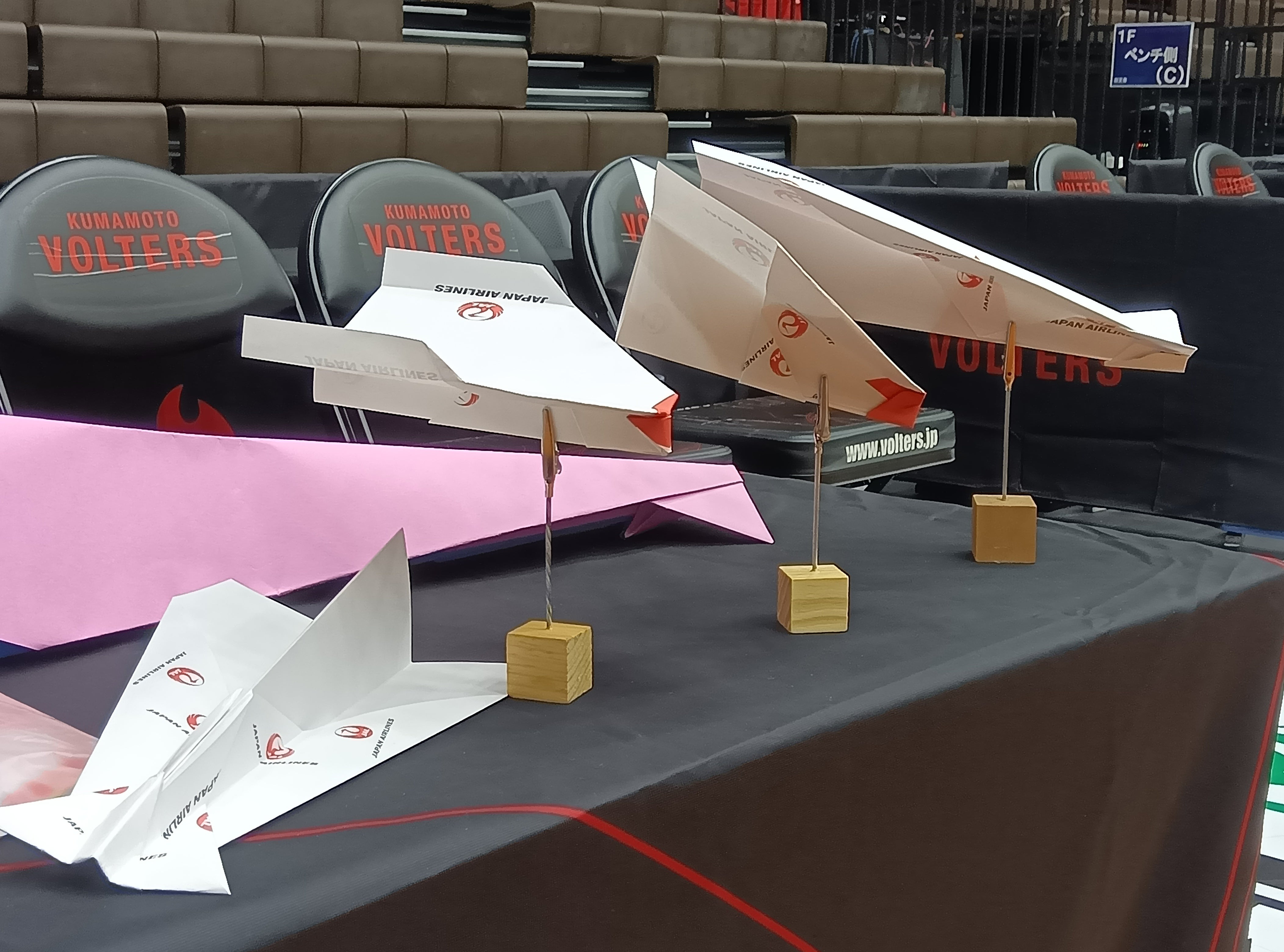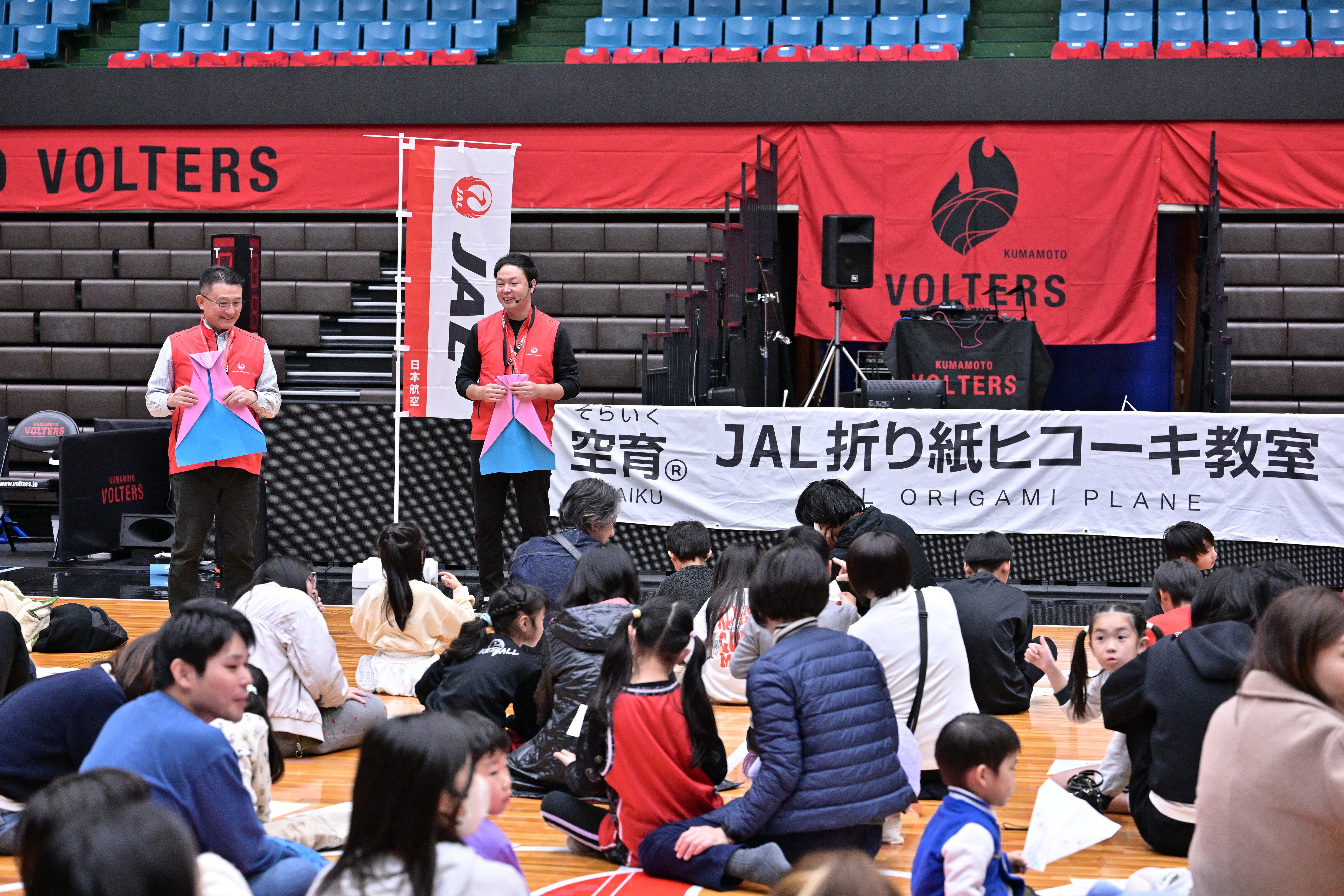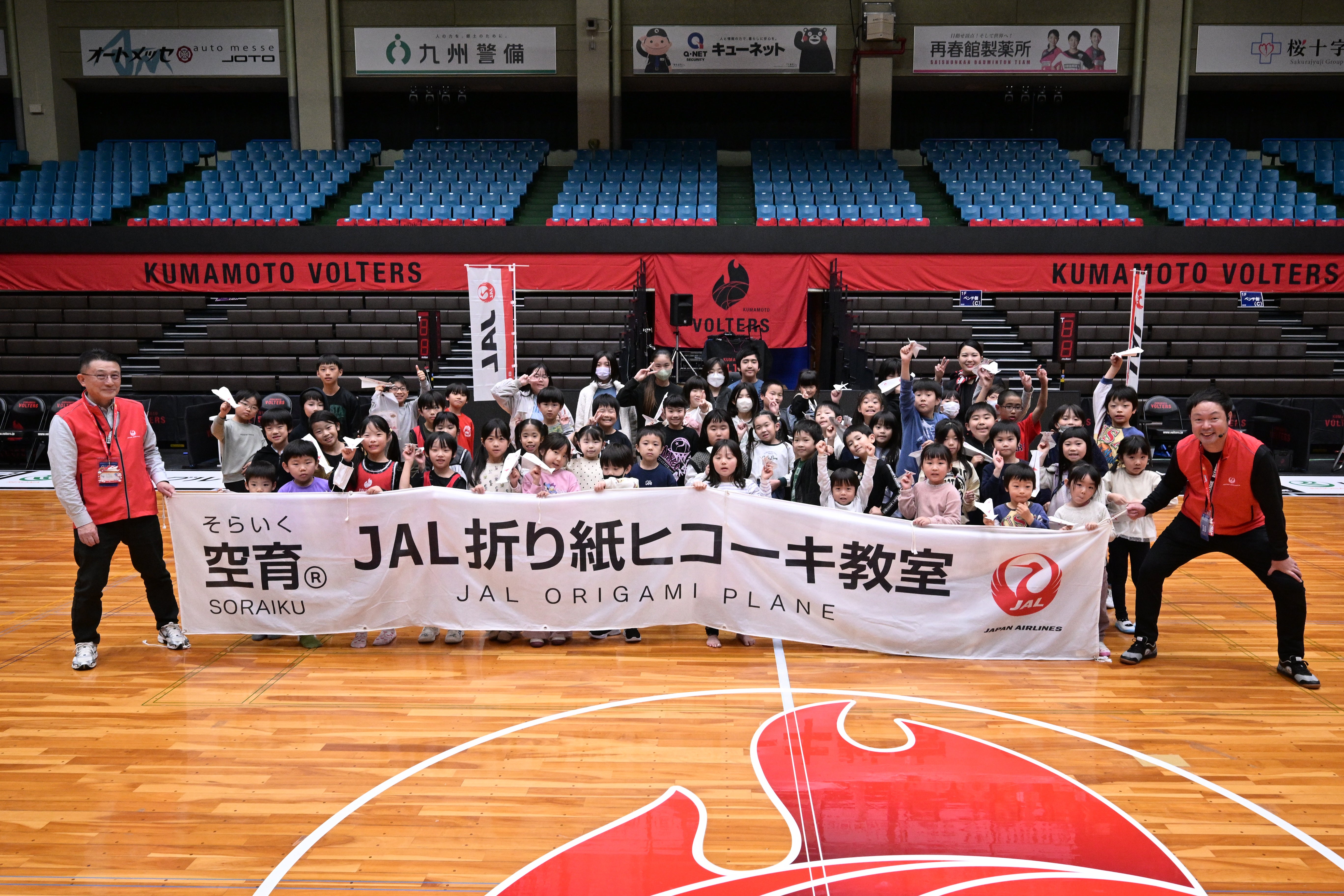 熊本ヴォルターズは、11月29日愛媛オレンジバイキングスとの熱戦の後、試合会場にて「空育®JAL 折り紙ヒコーキ教室」を開催しました。