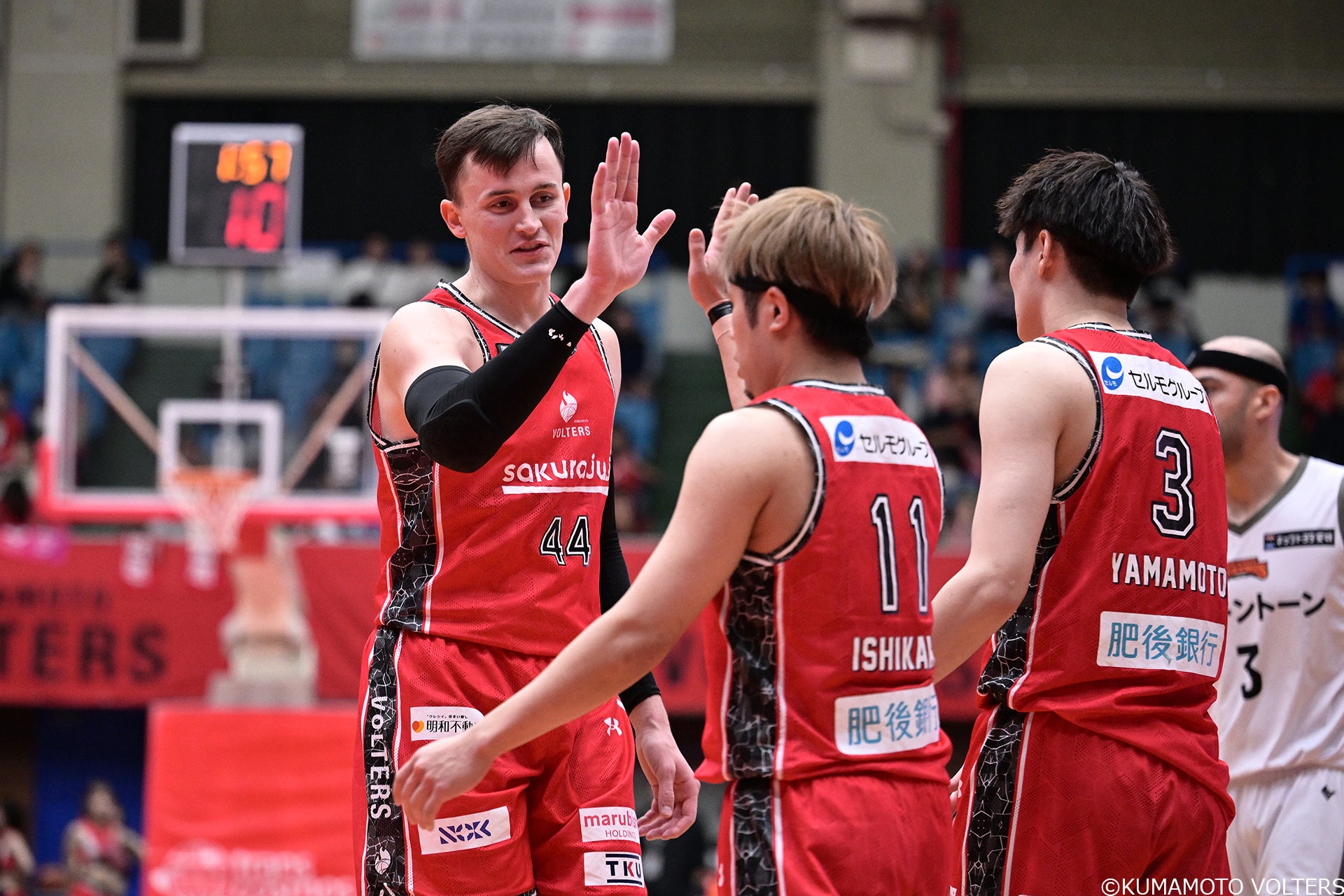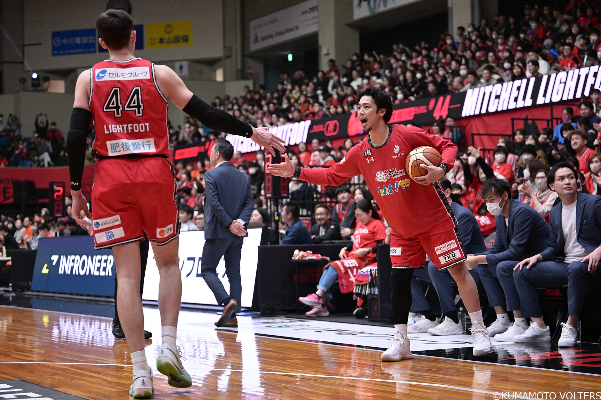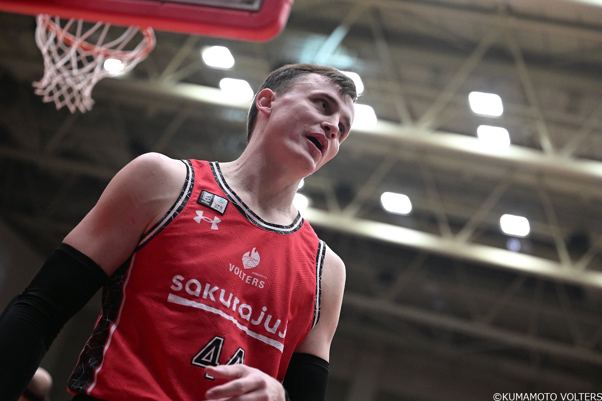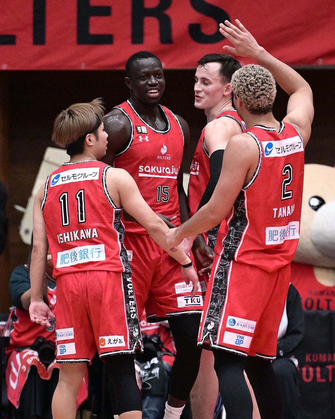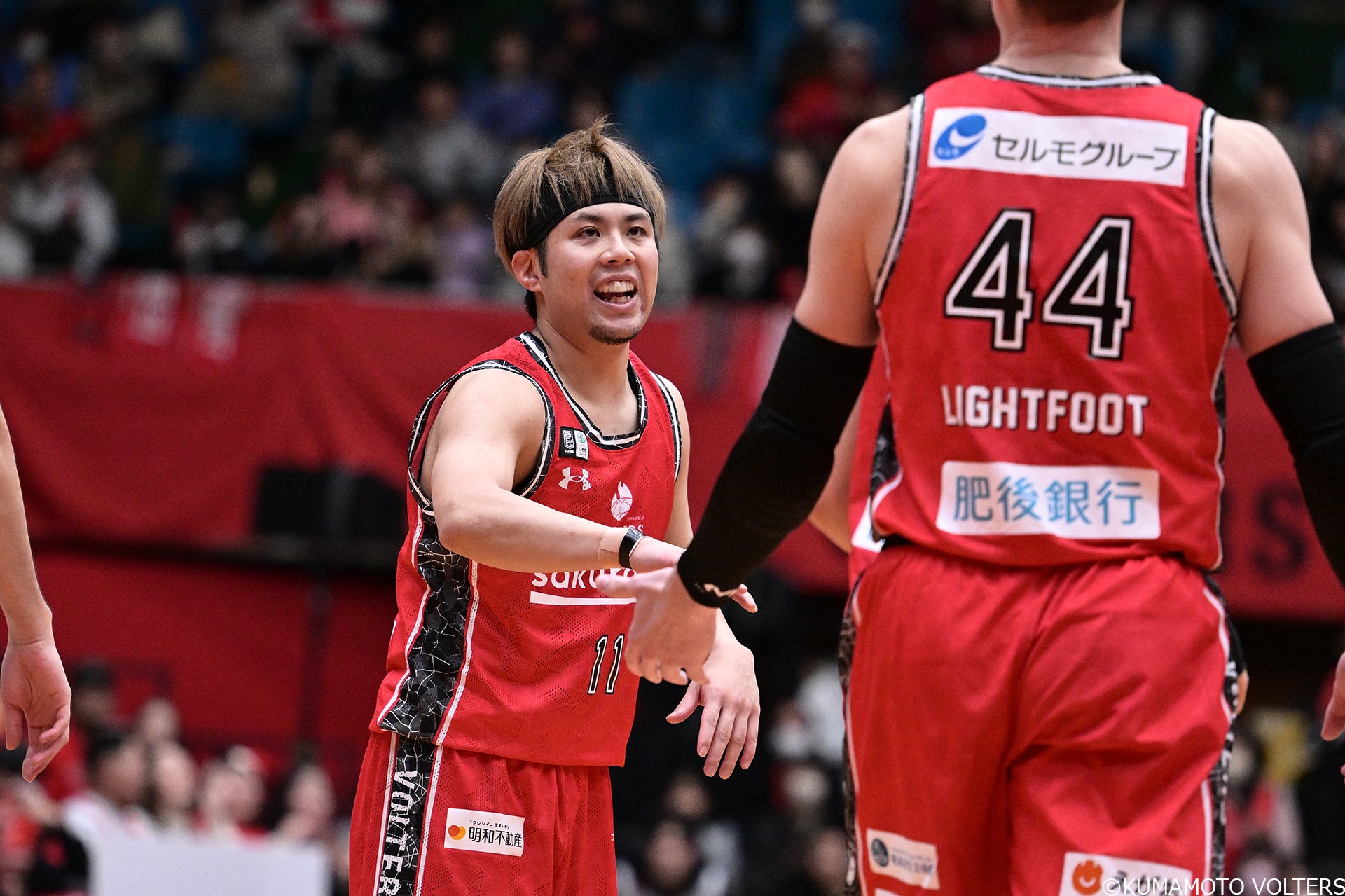 最初から強くファイトでき、今日の勝利につなげることができた。ゲームプランを毎回きちんと実行することが大事だと思う。 第1Q、磯野選手からのパスを受けてのアリウープは、とても良い連携をすることが出来た。 磯野選手はいつもアタックし、ディフェンスを引っ張る仕事が非常に上手だ。 そういったプレーで、私たちが今日の試合に勝つというトーンセットをしてくれ、それをきちんと決めることができた。 リバウンドはチーム全体で見ても42対26で勝っている。私自身も2桁(11本)取れたが、ゴール下でのプレーについて、両チームともすごく強くファイトできていたと思う。ただ、私たちの方が今日ペイントエリアをコントロールすることができて、勝利につながった。 実際にスタッツを見ると、エチェニケ選手とラミン選手が合わせて38分プレイできており、その中で15本のリバウンドも取れた。その2人合わせての結果はやはり大きな意味を持つし、勝利につながった。私たちにとっては非常に大事なリバウンドだった。 (5本のブロックについて) いつも私はチームメイトを助けたいと思ってプレーしており、ショットブロックすることによって、全体の流れを変えることもできる。 また、そこからオフェンスにつなげ、なるべくファストブレイクを狙っていきたいと思っている。そのため、自分にとっては非常に大事な場面だった。 また、献身的にプレーすることは、自分にとってある意味当たり前のことだと思っている。 (石川選手との連携について) オフシーズンに熊本が石川選手とサインしたときからすごくワクワクしていた。 彼は良いパサーで有名で、自分もぜひ彼とプレーしたいと思っていた。 そういう関係を作って連携を高めていくことは、日々の練習や試合、時間を重ねていくことによって、さらにうまく一緒にプレーできるようになってくるので、これからもより良くなっていくと思っている。 そして石川選手はすごく良い先生にもなってくれている。保坂選手は怪我でプレーできていないが、石川選手はいつも保坂選手に対していろいろ教えている。そうやって若手の選手を育ててくれる存在でもあるので、今後も保坂選手や自分が、彼の指導によってより良いプレーができるようになってくるのを楽しみにしている。 熊本ヴォルターズは、日本に来てプレーする機会を与えてくれた。実際に日本に来てみて、すごく良い時間を過ごしており、自分の家族も熊本の皆さんが優しく接してくれて、すごくいい生活を送っている。 もうすぐ娘がここで生まれて生活していくことになるので、このような機会を与えてくれた熊本のために、自分はハードプレーをしないといけないと思っている。 娘が12月末に生まれる予定だ。初めての子供ということですごくワクワクしている。熊本は自分たちにとっては、今まで他にバスケットをプレーした場所よりも、すごく優しくしてくれて、すごくいい時間を過ごしているので、今後もここで子供を育てていくことを楽しみにしている。 実は知り合いからカスタムのバスケットシューズを作ってもらった。娘の名前が入っているが、生まれた後の試合までは履かないことにしている。 今後のシューズに注目していただくと、皆さんの中で誰よりも早く名前を知ることができるので注目してほしい。